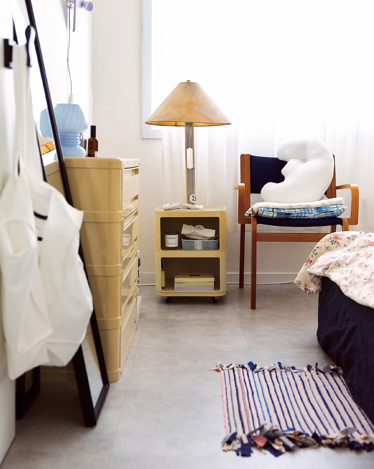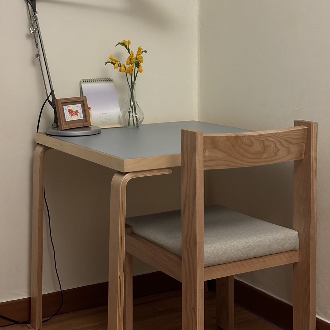작년에 다시 자취를 시작했어요. 혼자 사는 건 처음이라, 들이는 가구가 마음에 드는 것을 넘어 제게 이로워야 한다는 생각에 고민이 많았죠. 그중에서도 이 집의 중심은 책상과 의자여야 한다고 생각했어요. 누워있기보다 책상 앞에 앉아서 노는 걸 좋아하거든요. 기준이 명확했어요. 나무 소재일 것, 집 안 작은 기둥처럼 힘을 가질 수 있도록 네모날 것. 우뚝 우리 집에 서 있어야 하는 것들. 몇 주간의 고민 끝에 맞춘 차분한 하늘색 상판의 나무 책상과 다소 불편하지만 충분히 아름다운 의자는 바라보기만 해도 흡족합니다. 물론, 앉으면 더 좋고요.