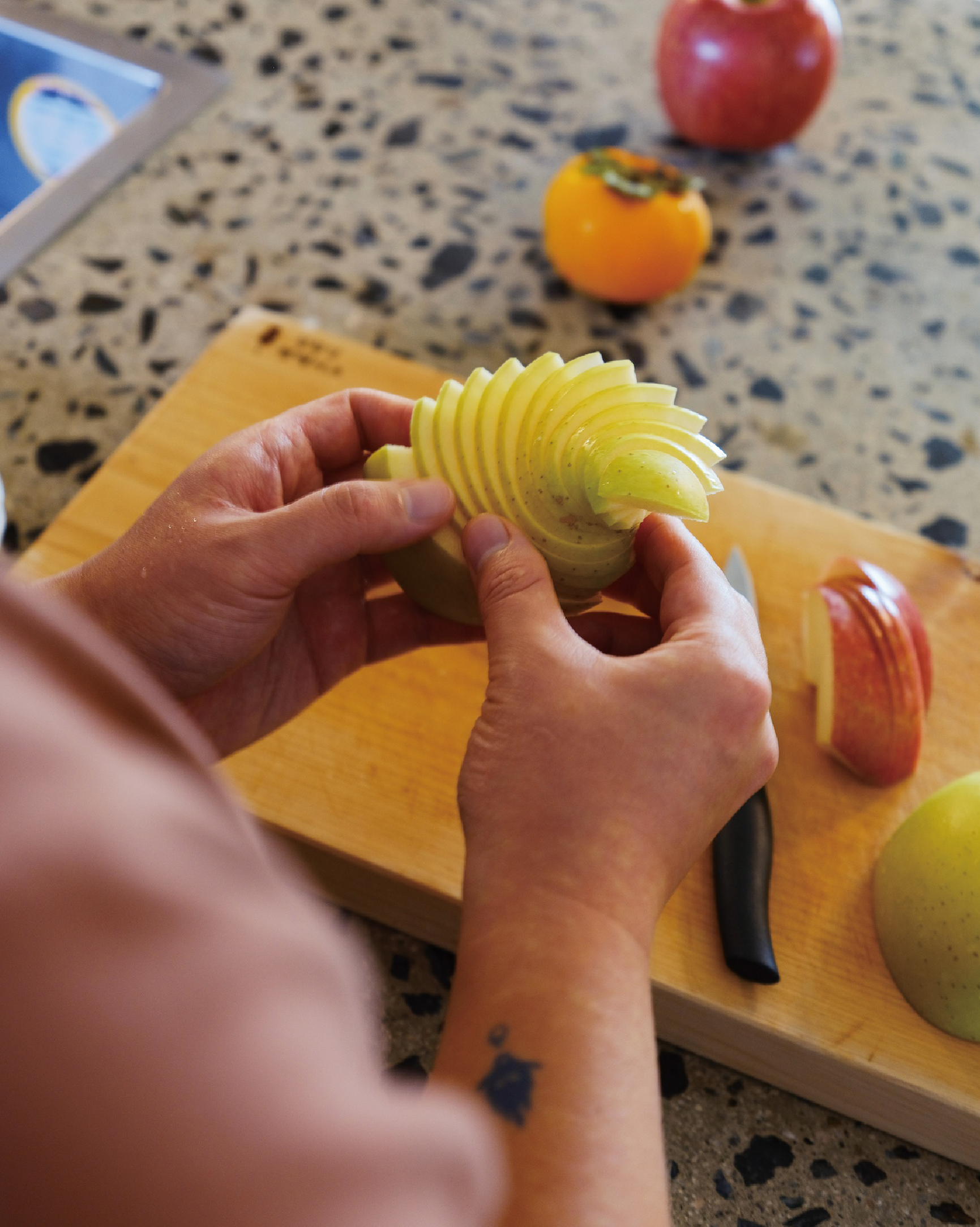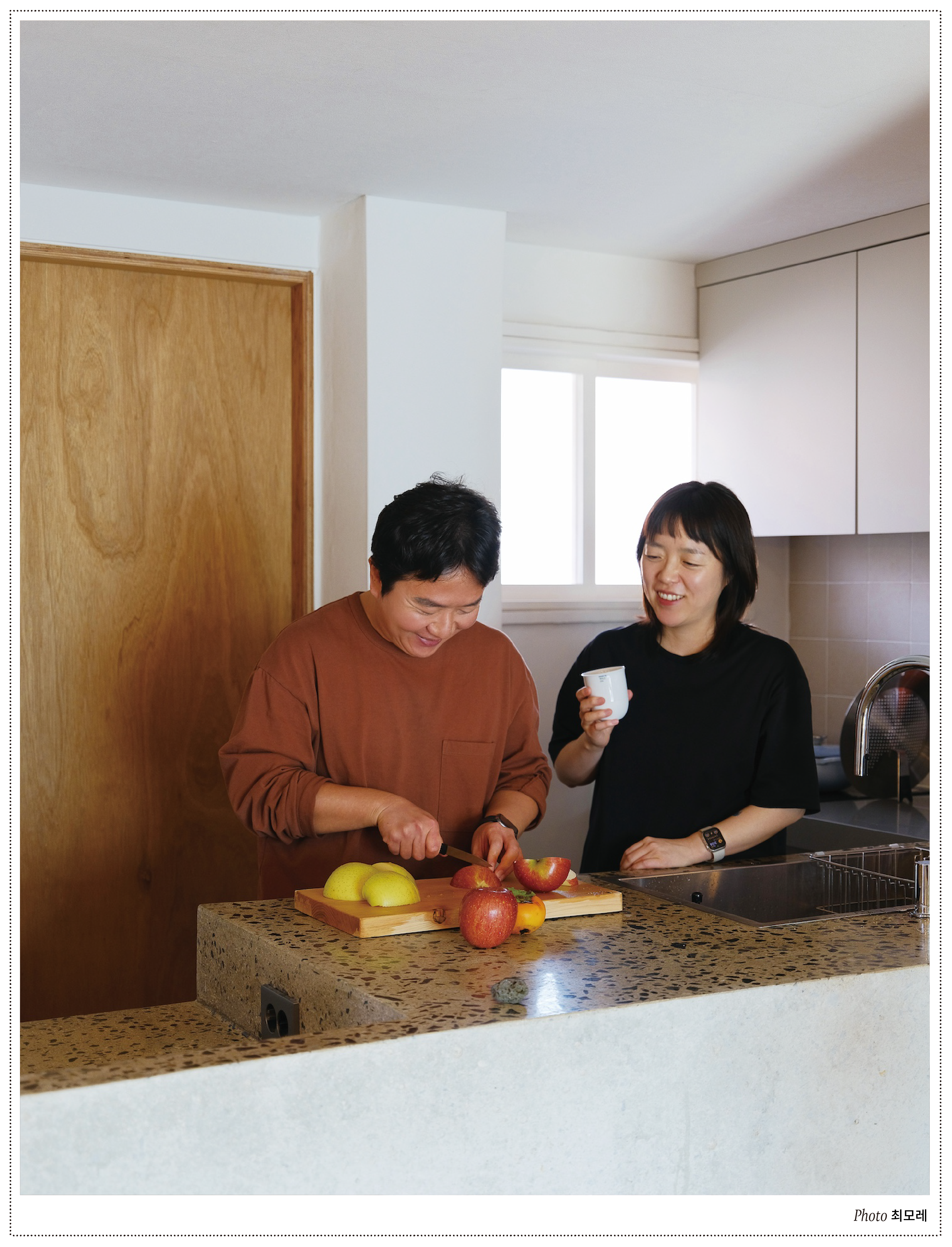 재기와 유청은 독특한 의식으로 하루를 연다. 한 사람이 사과를 깎으면 다른 이가 먹는 것. 특별한 건 없다고? 테이블에 놓인 접시를 보자. 얇게 썰린 과육이 아름다운 곡선을 그리며 펼쳐지고, 레고 블록 같은 조각이 탑을 이룬다. 건축사 재기의 손에서 탄생한 사과 한 접시는 영화 전문 도서 편집자 유청의 사진첩에 담겼다. SNS에 3년간 쌓은 기록은 한 권의 책으로도 탄생했다지. 사과 다섯 알을 들고 이들을 찾았다. 향긋한 내음 폴폴 나고 아삭한 소리가 연신 들리는, 그런 대화였다.