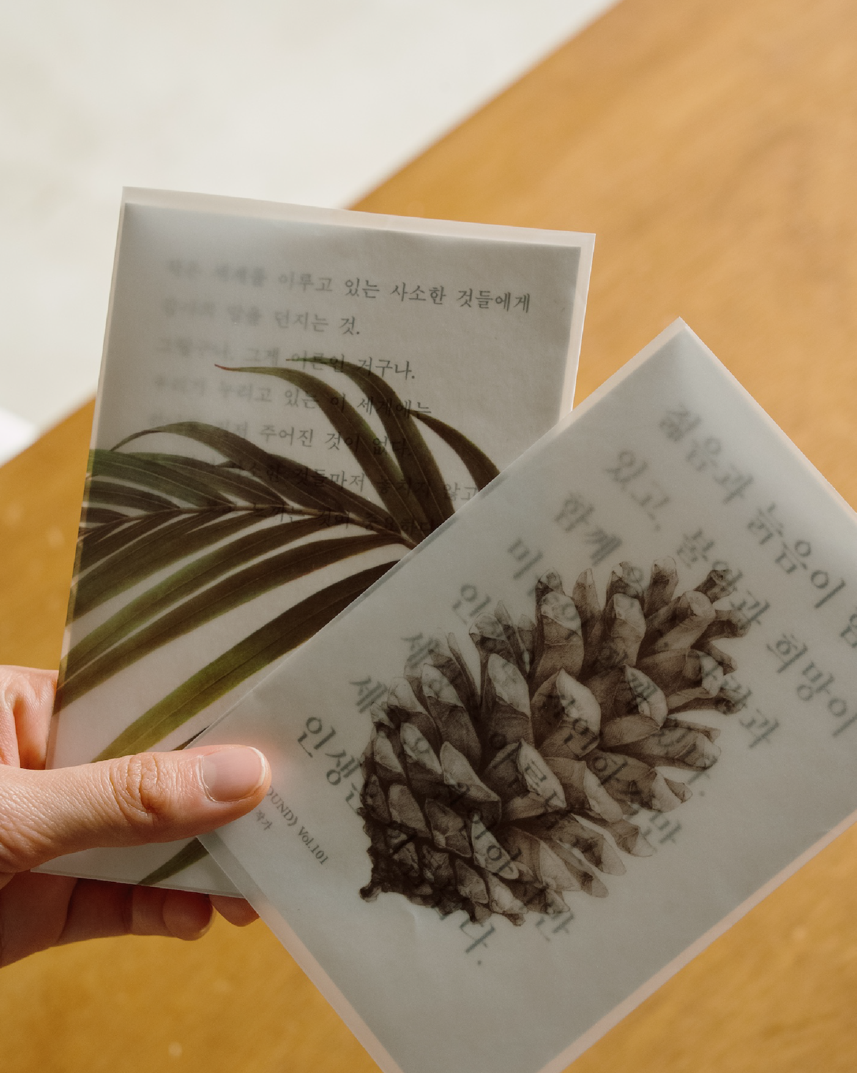 주변을 관찰하며 작고 느긋한 물건을 만드는 브랜드 ‘소언’과 함께 엽서 세트를 제작했습니다. 안이 비치는 투명한 트레싱지 봉투 속에, 《AROUND》 연재 필진 한수희 작가의 아름다운 문장을 정성껏 새겨 넣었어요.