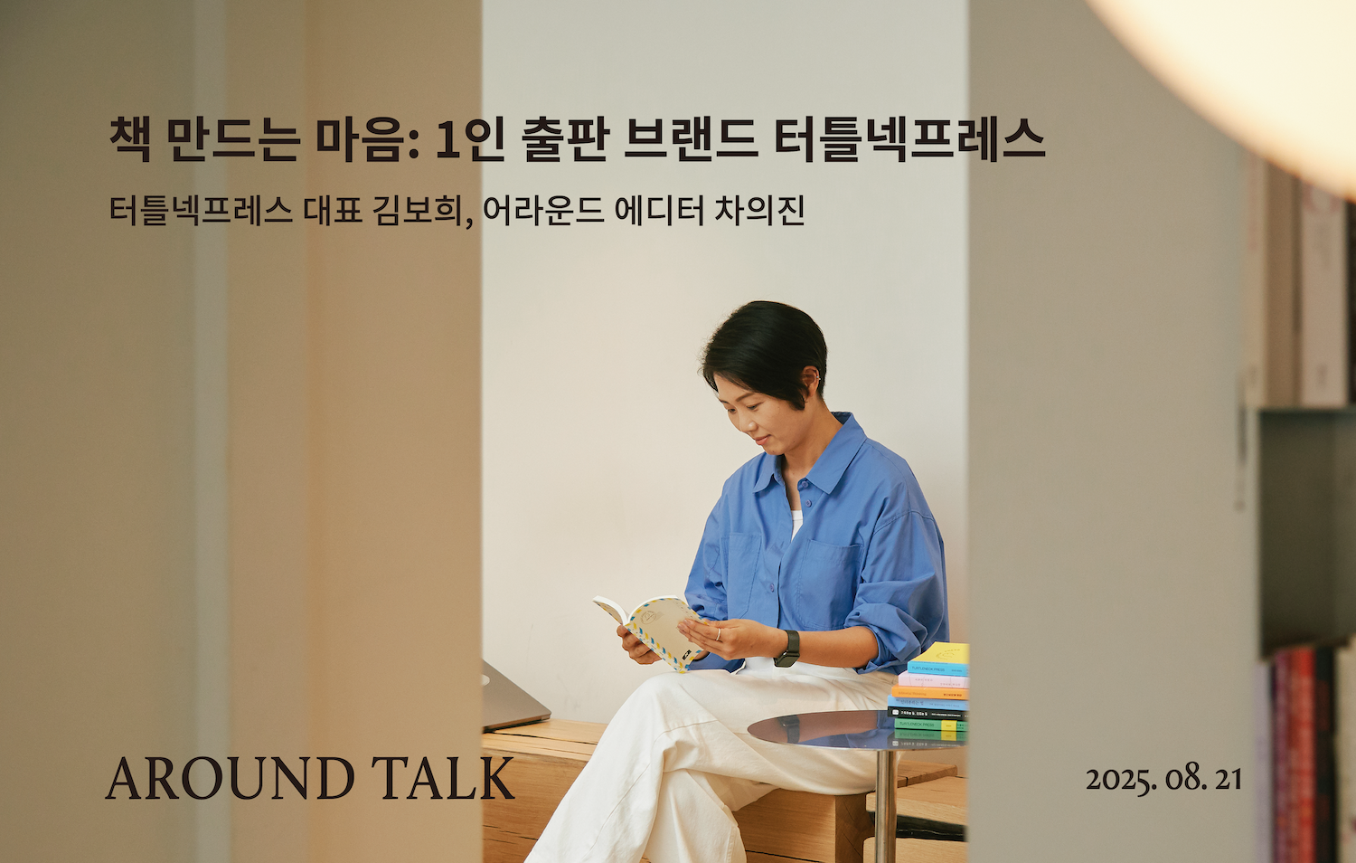 지난 8월, 어라운드 사옥에서 1인 출판 브랜드 터틀넥프레스의 김보희 대표와의 토크가 열렸습니다. 차의진 에디터와 함께 김보희 대표가 생각하는 책의 가치, 출간물을 통해 전하고자 하는 이야기에 대해 깊이 나누었는데요. 터틀넥프레스가 3년 차 1인 출판 브랜드로 성장하기까지의 과정과 기쁨, 시행착오의 순간들도 들을 수 있었습니다. 어라운드 인터뷰 비하인드 스토리까지 촘촘하게 담은 영상이 궁금하다면 아래 버튼을 통해 감상해보세요. |
