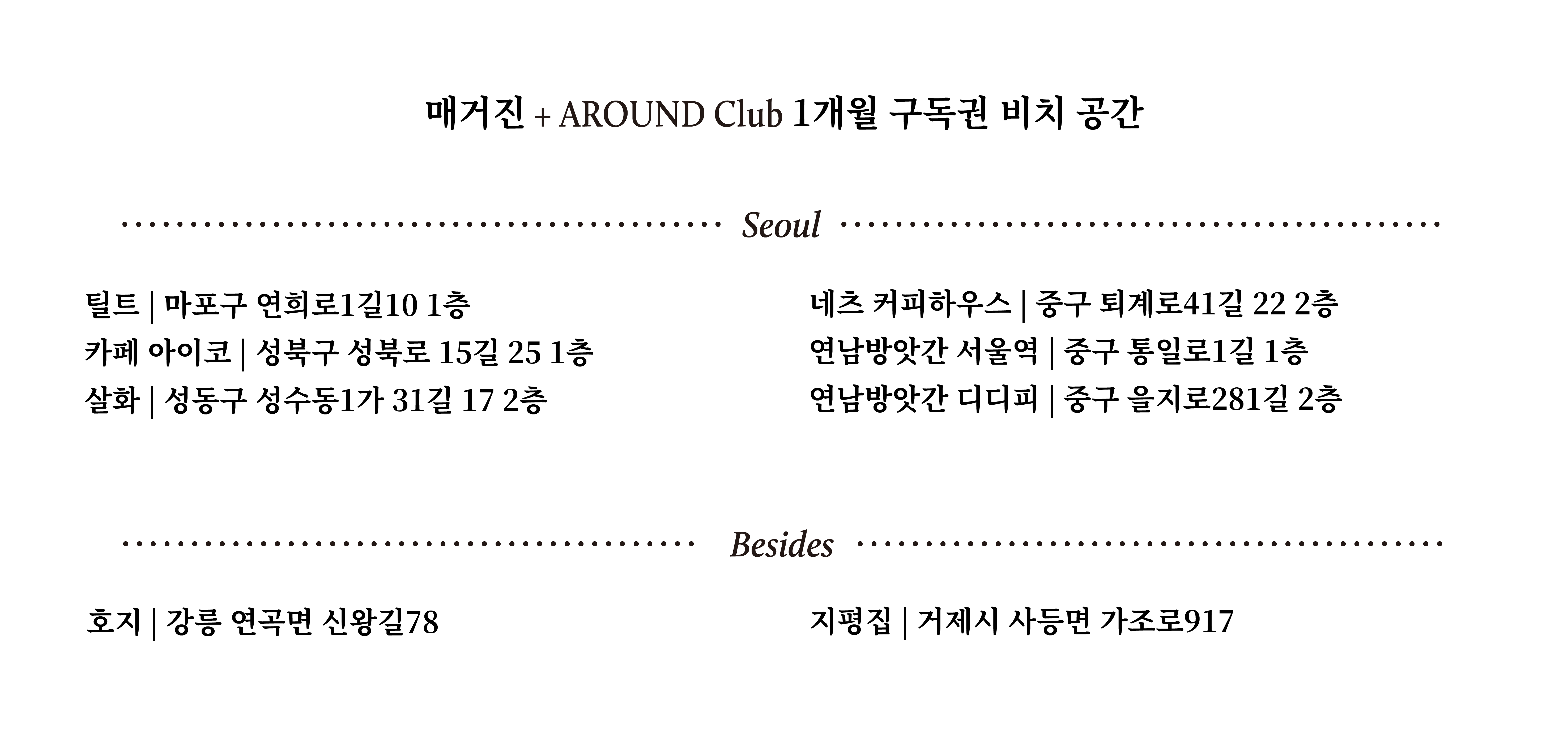 매거진 《AROUND》를 온라인으로 즐길 수 있는 ‘AROUND Club’을 구독하면 3,200여 개가 넘는 기사와 홈페이지 한정 콘텐츠, 구독자만의 특별한 혜택까지 모두 경험할 수 있어요. 서울, 경기, 제주에 마련된 아래 공간을 찾아주시면 ‘AROUND Club’ 1개월 이용권을 받을 수 있답니다. 더 많은 독자님 곁에서 《AROUND》의 이야기를 전해드릴 수 있도록, 비치 공간을 늘려가는 중이니 주변을 살피어 마음에 드는 곳이 있다면 편안하게 걸음을 옮겨주세요. |