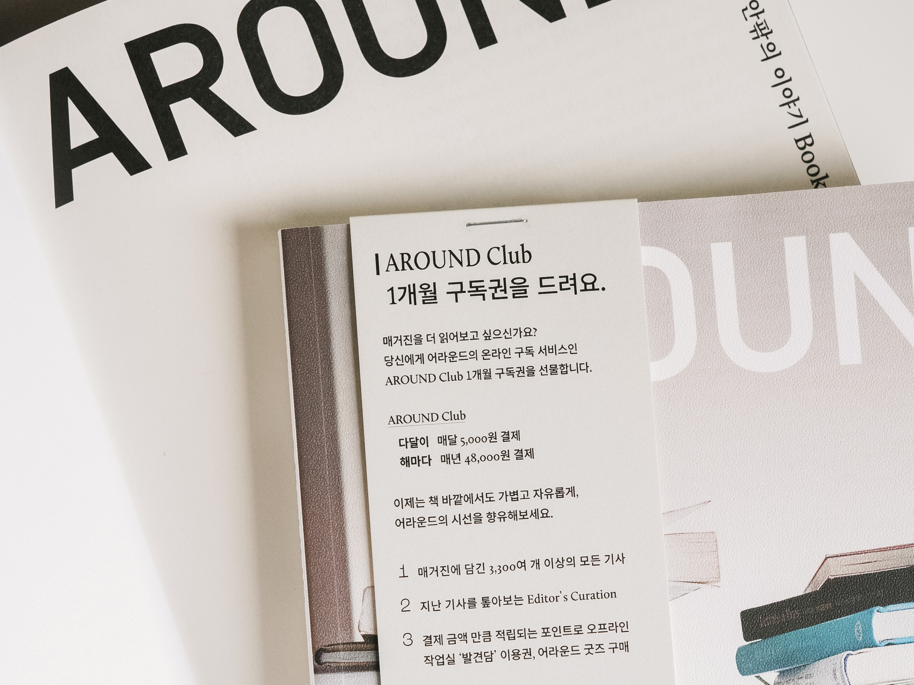 어라운드를 보다 더 가까운 일상에서 만나고픈 독자분들을 위해 ‘AROUND Club’ 혜택을 마련했습니다. 지난 시간 어라운드가 꾸준히 쌓아온 3,200여 개 이상의 기사를 온라인 구독 서비스 ‘AROUND Club’을 통해 공식 홈페이지에서 만나 보세요. 주변을 살펴 모아둔 다정한 이야기를 손에 내어드릴게요. |