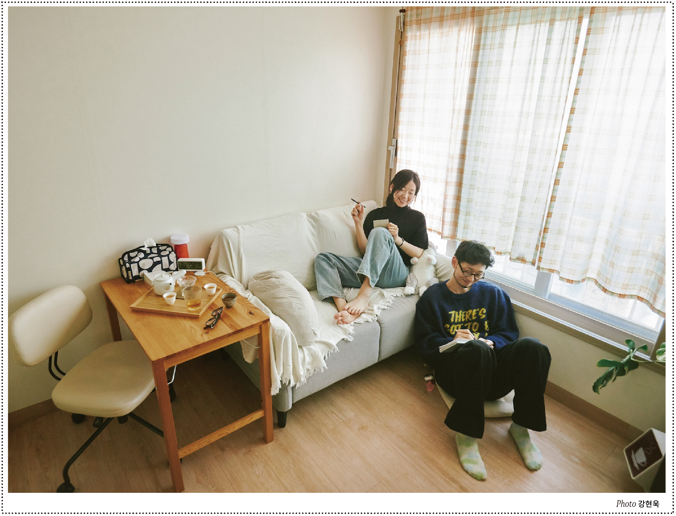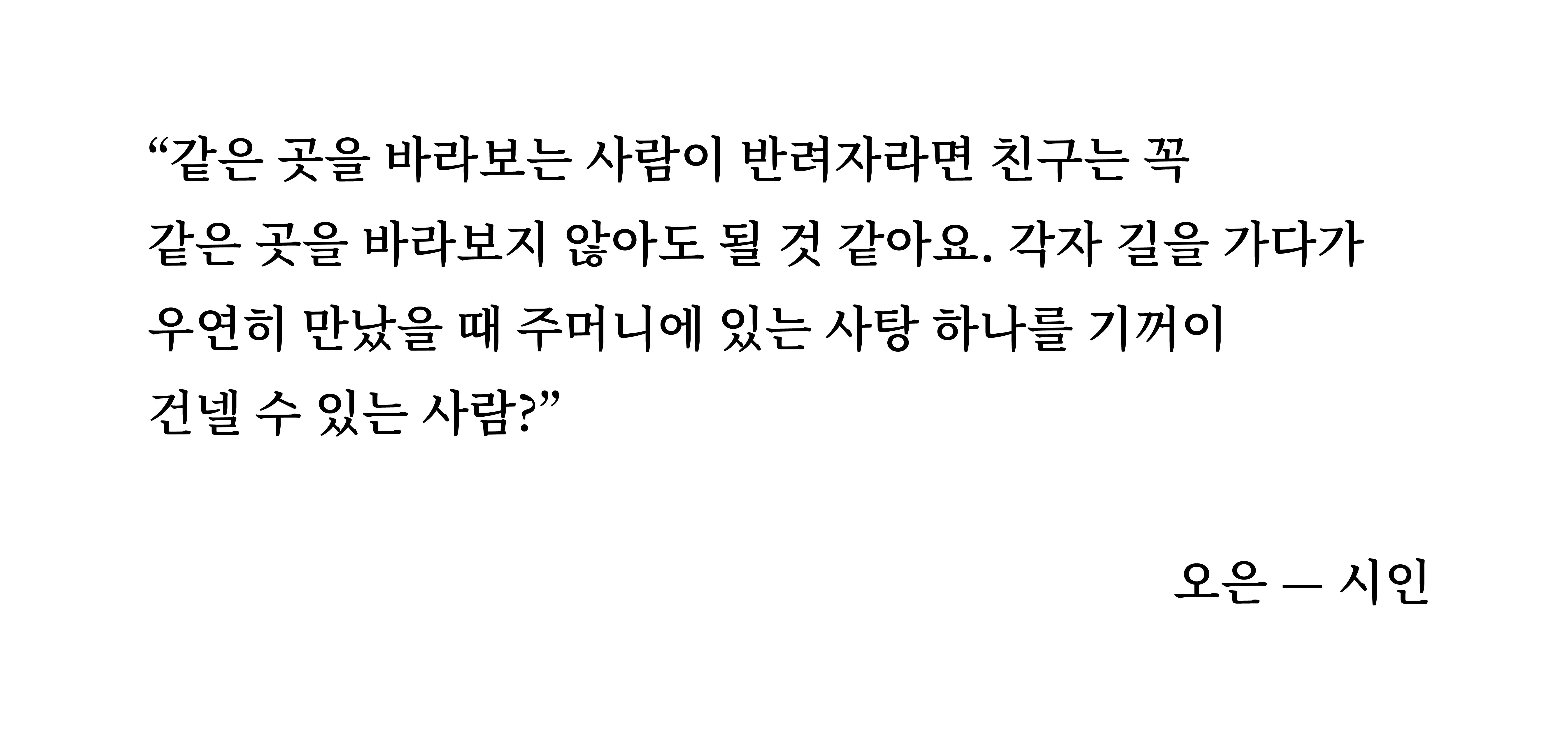 훤 정말이지 그렇게 얘기하고도 할 얘기가 정말 많이 남아 있어요. 요즘은 그런 종류의 우정이 잘 없잖아요. 말 한마디도 너무 조심하게 되고, 전화 걸고 싶어도 ‘바쁠 텐데. 너무 늦은 거 아닌가?’ 하고 생각하게 되고요. 서로를 침범하는 게 자유로워서, 조금 덜 조심하게 되어서 좋아요. 사월이와의 우정은 제 우정 역사에 새로운 국면을 만든 신호탄이었어요. |