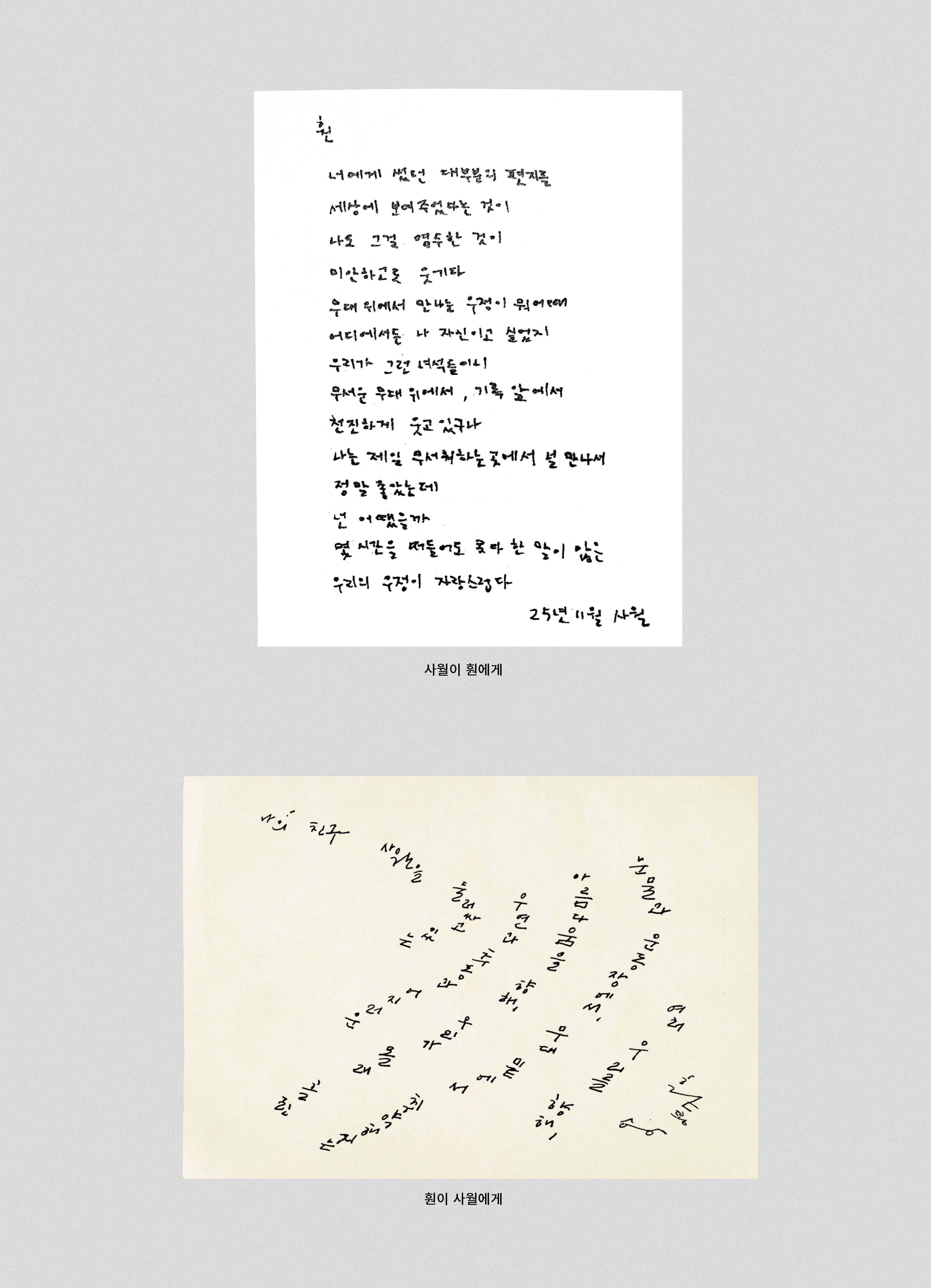 훤 잘 모르겠어요. 작가로서 경계해야 하는 것 중 하나가 자기 연민에 빠지는 건데, 그런 의미에서 어느 순간에는 누군가 우는소리 하는 게 보기 싫을 때가 있잖아요. 반대로 어떨 때는 이 사람이 취약해서 좋다고 느낄 때도 있고요. 사월과 편지를 쓰면서 우리가 비슷하고 또 다르게 연약해지는 모습을 같이 살핀 것 같아요. 때때로 거울처럼 서로를 들여다보면서요.