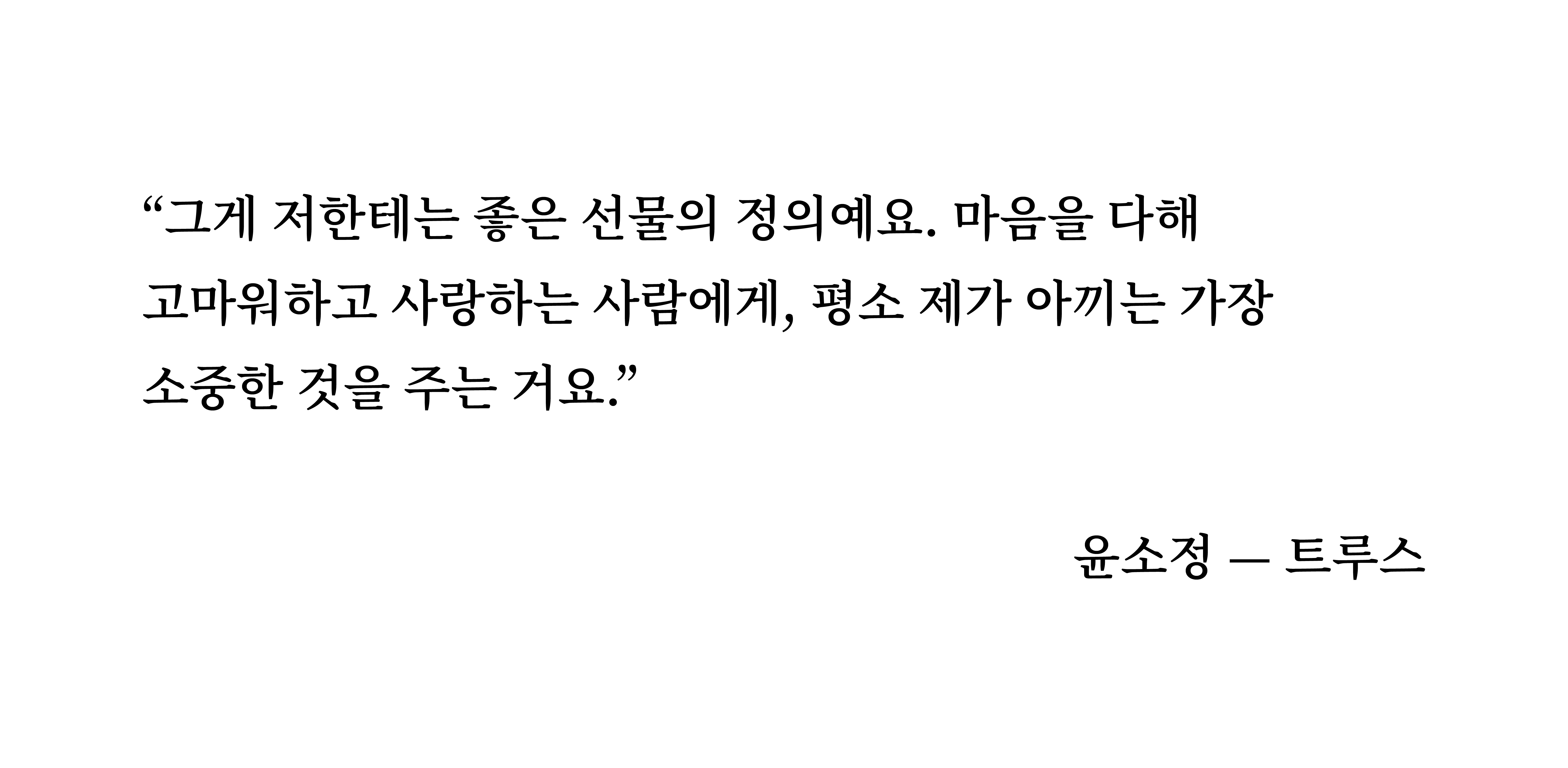 1세부터 95세까지 크리스마스만 되면 루돌프 귀를 다는 가족. 바로 우리 집이에요. 어릴 땐 매해 열네 명의 인원이 〈호두까기 인형〉 발레 공연을 보러 갔는데, 그땐 앞에 앉은 할아버지가 조는 모습을 놀리는 게 더 재미있었죠. 손에 반짝이를 묻혀가며 꾸미는 크리스마스트리, 매번 실패하는 이브의 불침번, 아침이면 기가 막히게 놓여 있던 선물들, 생일 축하 노래를 부른 뒤 주인공 대신 모두가 후~ 불었던 성탄 케이크의 촛불까지. 어쩜 이렇게 즐거운 기억뿐일까 신기하고, 그 뒤에서 분주했을 집안의 어른들이 사랑스러워요. 이 꾸준한 행복을 딸에게 물려주고 싶고요.