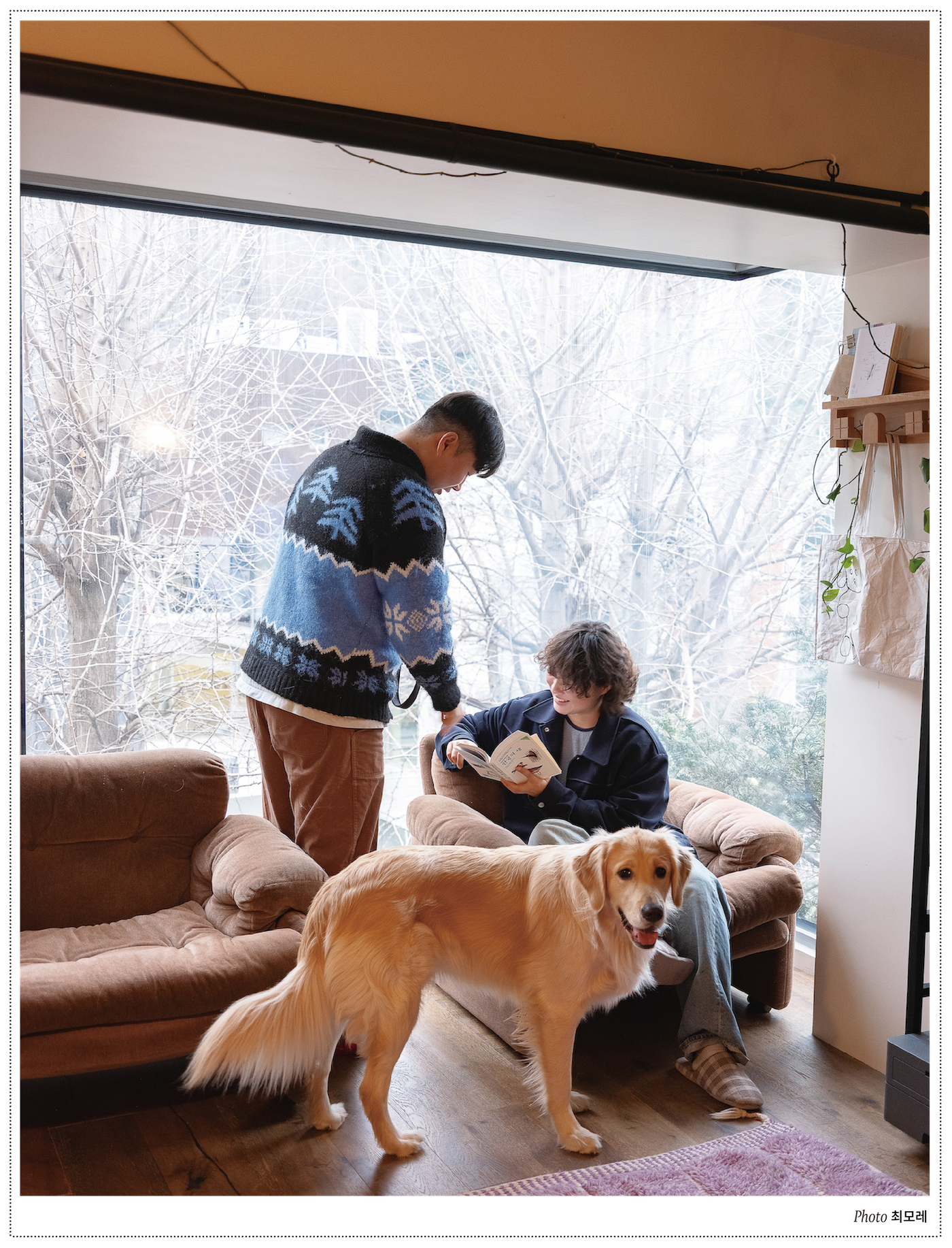 예진 맞아요. 인왕산도 가깝고 집 뒤쪽으로도 산이 있어서 산책하고 싶을 때마다 코스를 만들어 걸을 수 있어요. 그게 생각보다 큰 힘이 되더라고요. 반려동물과 함께 사는 사람들이 많다 보니, 일부러 애쓰지 않아도 오며 가며 인사하게 되는 정도의 자연스러운 교류가 있고요. 그 거리감이 참 좋아요. 동네가 번잡스럽지 않은 점도 마음에 들고요. 물론 불편한 점도 많아요. 마트나 약국 같은 편의 시설이 거의 없고, 언덕도 많죠. 여가 공간은 있지만 생활 시설은 부족한 편이에요. 그래도 그 정도는 감수할 수 있어요. 내려가면 서촌에 시장도 있고요. 왜 산꼭대기에 사냐고 묻는 분들도 있는데, 그건 인식의 차이인 것 같아요. 저희한테는 이 생활이 잘 맞거든요.