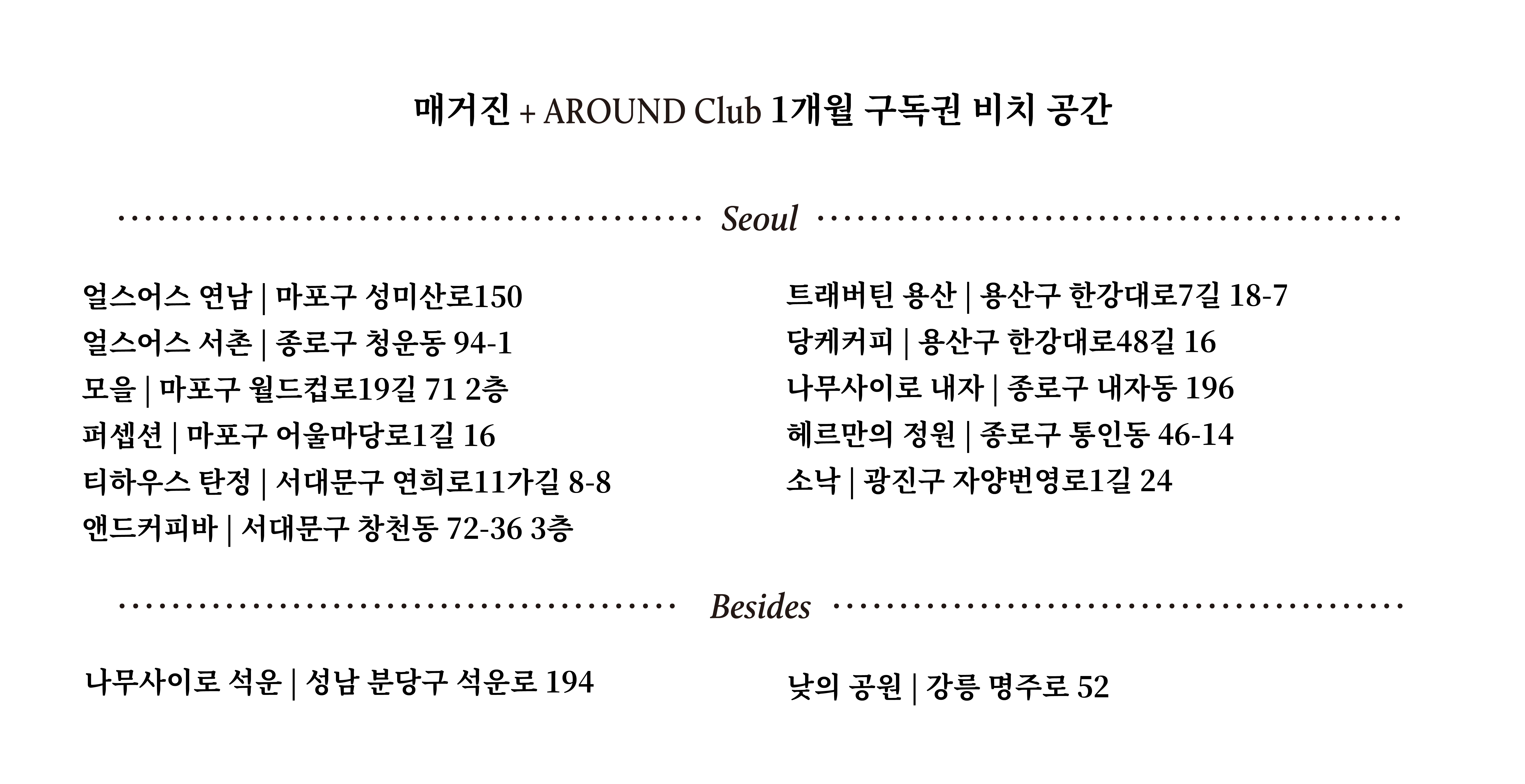 매거진 《AROUND》를 온라인으로 즐길 수 있는 ‘AROUND Club’ 1개월 이용권이 새로운 장소에 배포되었습니다. 얼스어스 연남·서촌점, 티하우스 탄정, 모을 등 여러 공간에서 이용권을 받아 보세요. ‘AROUND Club’을 구독하면 3,200여 개가 넘는 기사와 홈페이지 한정 콘텐츠, 구독자만의 특별한 혜택까지 모두 경험할 수 있답니다. |